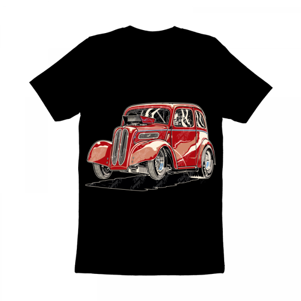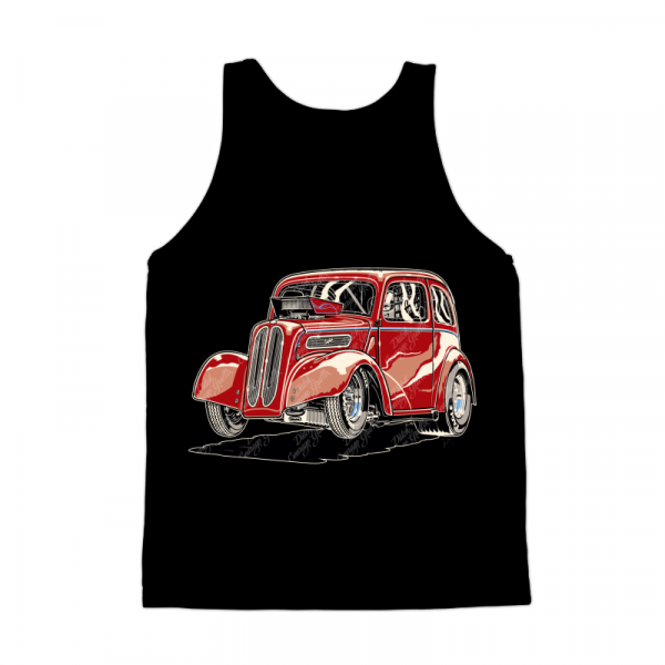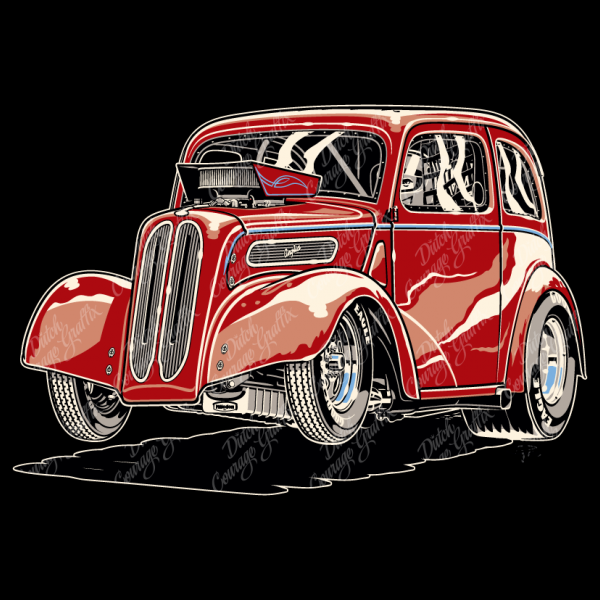 1948 British Anglia “Pop” tudor sedan drag racer launching - vector illustration