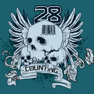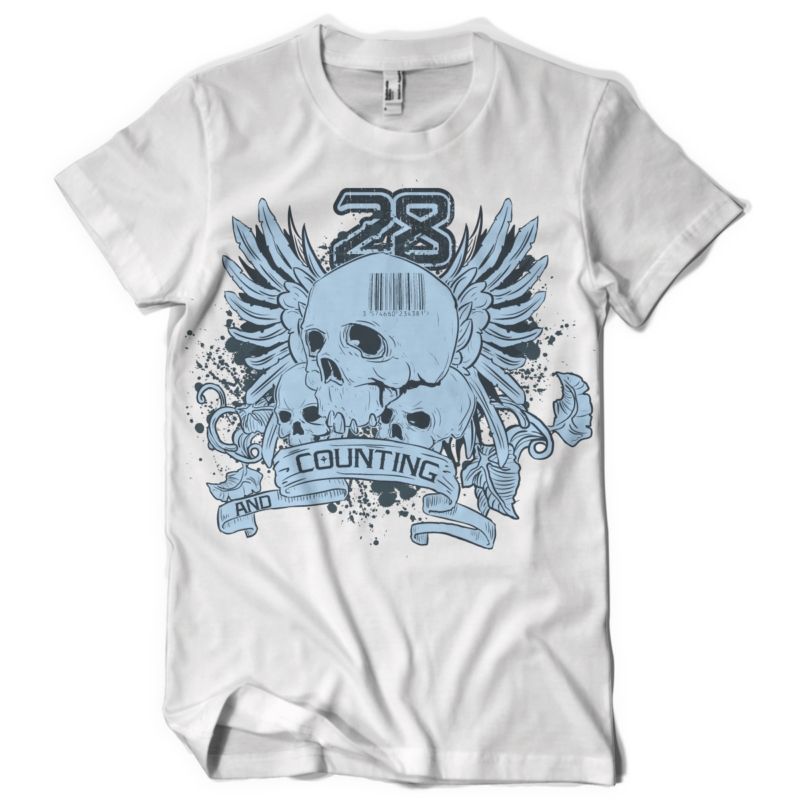 Celebrating rock t-shirt design featuring detailed skull with wings, easily to add your own brand. 28 and counting t-shirt template is available in vector format and can be used for digital printing and screenprinting. The file will be available for Adobe Illustrator, Adobe Photoshop and Corel Draw.