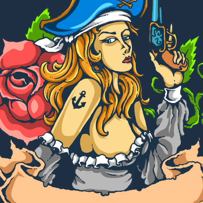 Vector illustration of sexy pirate woman with gun and banner, made with vintage tattoo style drawing. Ready to print on t-shirt.
