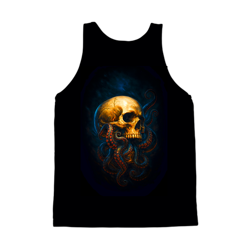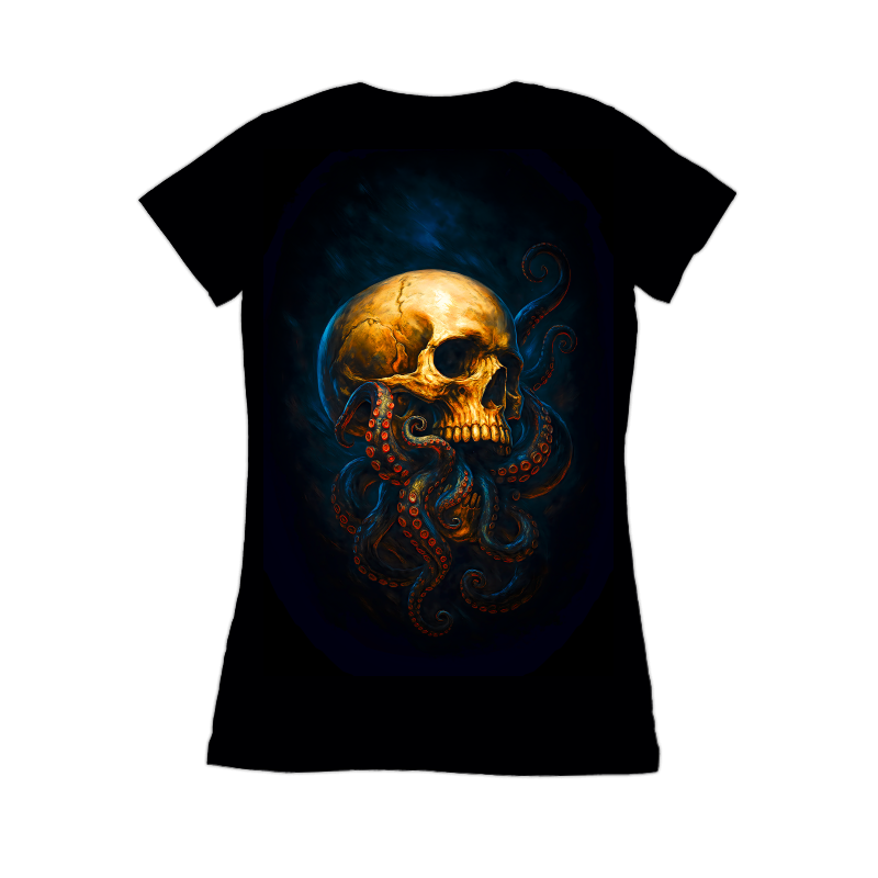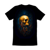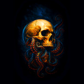 This captivating artwork presents a skull entwined with the tentacles of an octopus, set against a dark, moody background. The skull, rendered in shades of gold and yellow, appears aged and weathered, with cracks and imperfections adding to its realism. The octopus tentacles, colored in deep blues and reds, coil around the skull, creating a sense of both menace and artistic beauty. The contrast between the warm tones of the skull and the cool tones of the tentacles enhances the visual impact. The overall composition evokes a sense of mystery and the macabre, blending elements of horror and the natural world. The artwork's painterly style and dramatic lighting further contribute to its eerie and captivating atmosphere, making it a striking piece. The design uses a dark background to emphasize the details of the octopus and skull. The skull has an aged appearance with cracks and imperfections. The octopus tentacles are wrapped around the skull, creating a visually stunning effect.