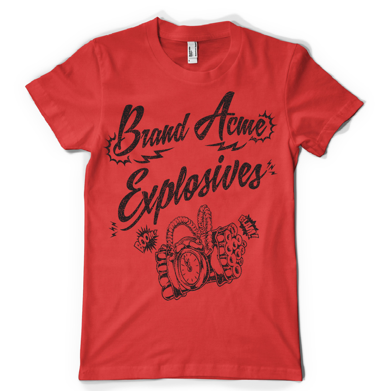 Acme t-shirt design features a detailed screen print of explosive acme now available for Adobe Illustrator, Adobe Photoshop and Corel Draw and can be used for digital printing and screenprinting .
