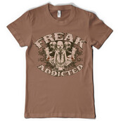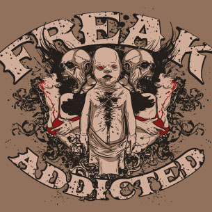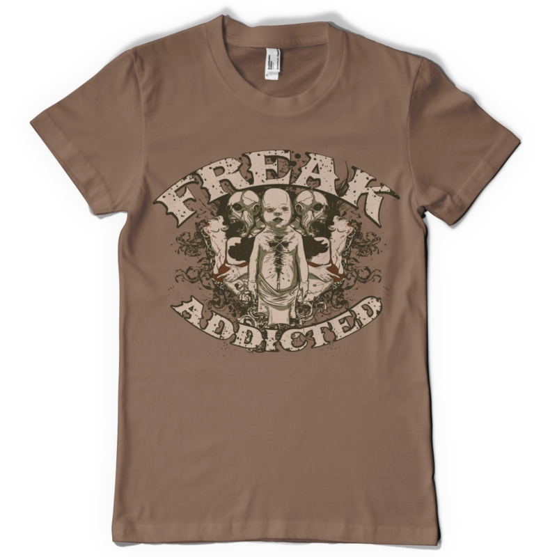 Horror t-shirt design presents detailed baby cutted on chest, reflection of two skull man and a woman, flourish details. Addicted to horror is available in vector format for Adobe Illustrator, Adobe Photoshop and Corel Draw and can be used for digital printing and screenprinting .