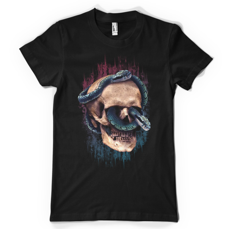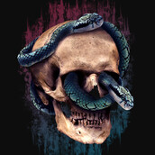 "Affiliation" is a unique illustration of a Skull with 2 snakes wrapping around it creating a mutual connection between two species paired with a modern grunge styles and eye-catching colors. File contains a PSD file with 17 x 24 in size.