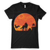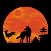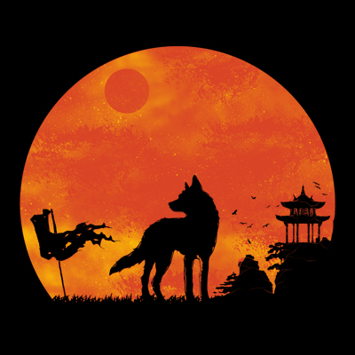 Illustration of a silhouette wolf standing tall across the high mountains of Japan after a war. The flag which is still waving symbolizes the fight is over and there will be no war again.