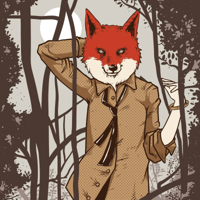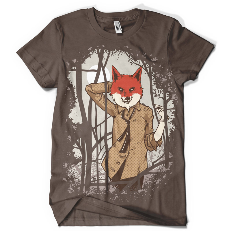 Alluring Fox T-shirt design featuring detailed fox, dressed as a human with a forest background. The files available for Adobe Photoshop. Files are available in eps (the CS version) and psd format.