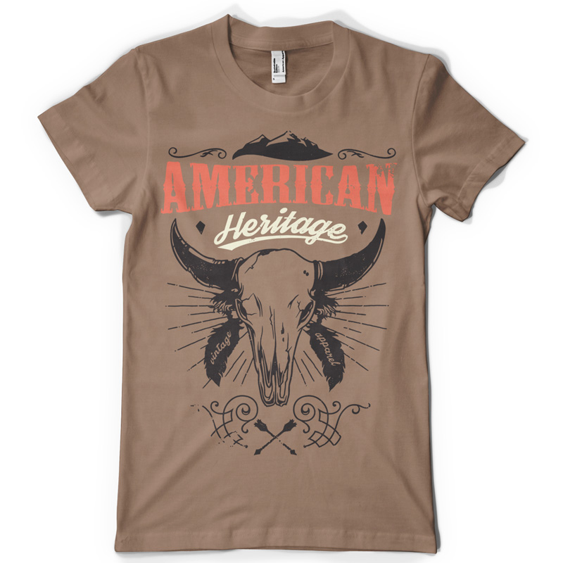 American Heritage digital t-shirt design template in vector format, featuring detailed animal skull, with Native American theme and elements, now available for Adobe Illustrator, Adobe Photoshop and Corel Draw. The file can be used for digital printing and screenprinting.