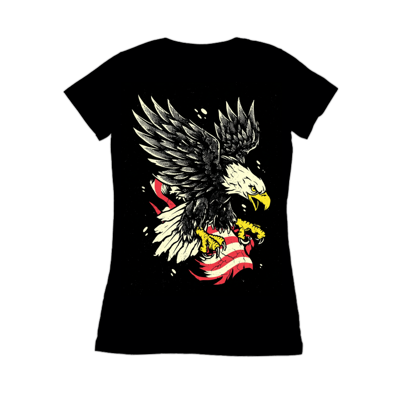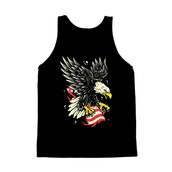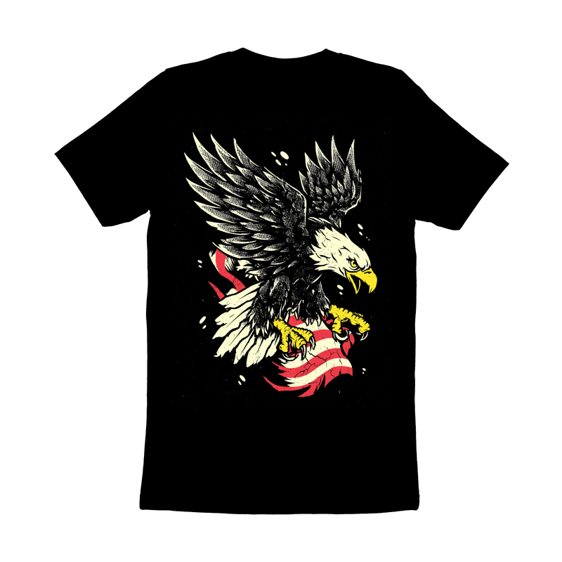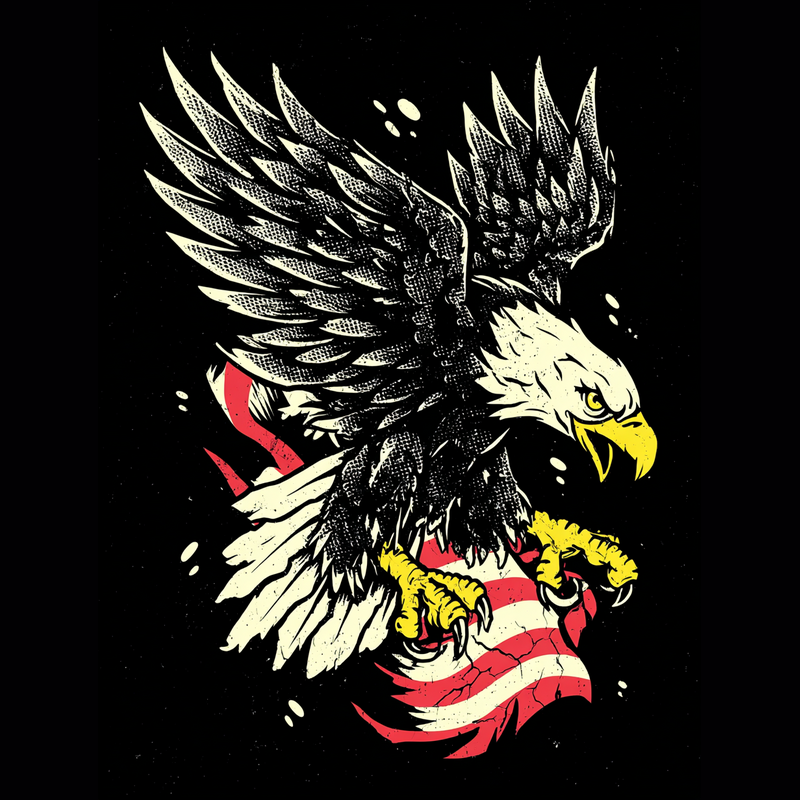 This powerful design features a stylized American bald eagle with its talons firmly gripping a distressed American flag. The eagle is depicted with detailed feathers and a fierce expression, conveying strength and freedom. The flag appears weathered and cracked, adding a vintage or rebellious touch to the overall composition. The color palette is limited, emphasizing the contrast between the eagle, the flag, and the black background. The design has a bold, graphic quality, making it suitable for various applications. The overall aesthetic blends patriotism with a touch of edgy, urban style.