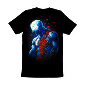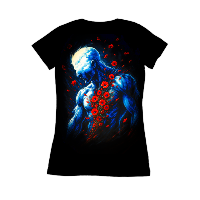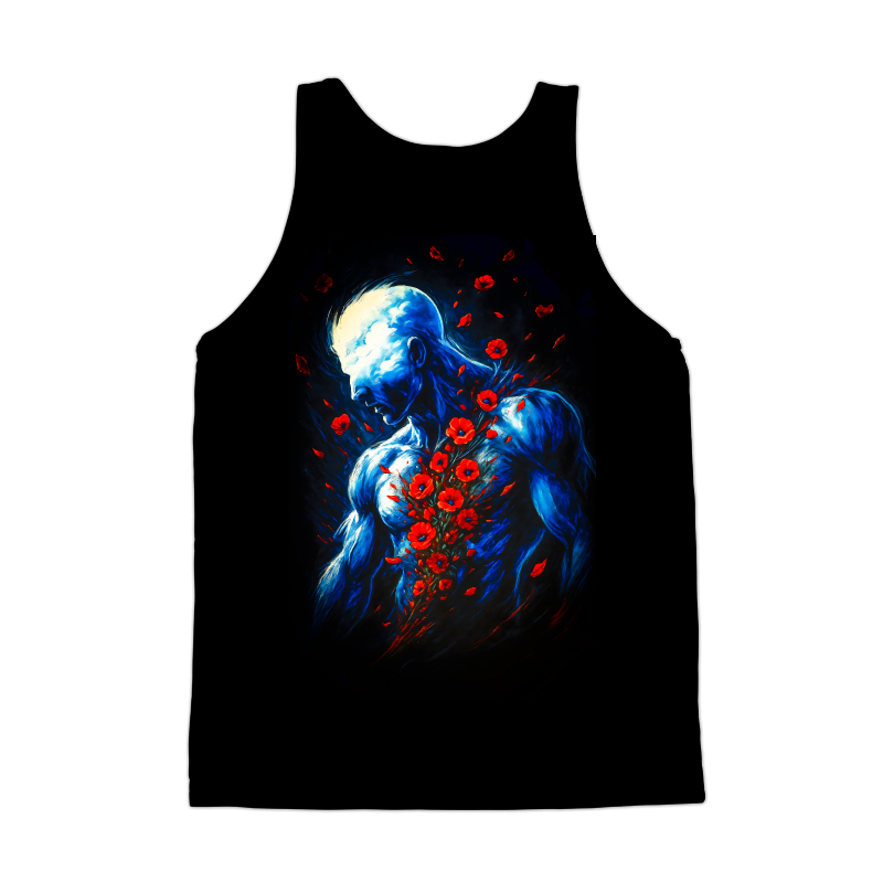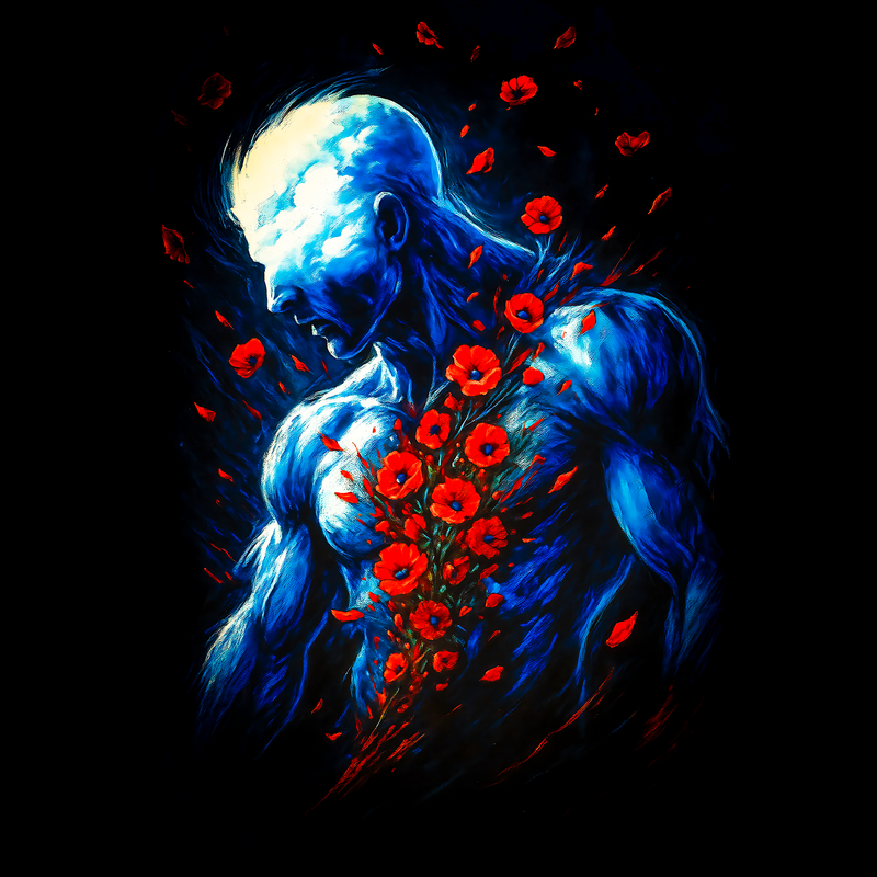 This artwork presents a striking visual narrative of the human form intertwined with nature. A muscular, blue-toned figure stands against a stark black background, its head a luminous cloud-like mass, devoid of distinct facial features. A cascade of vibrant red poppies erupts from the chest, symbolizing perhaps, a painful yet beautiful affliction or emotional outpouring. The figure's posture conveys introspection or sorrow, enhancing the artwork's melancholic mood. The contrast between the cool blues of the skin and the fiery reds of the poppies creates a visually arresting composition, drawing the viewer into a contemplation of inner turmoil and the interplay between strength and vulnerability. The style is reminiscent of surrealist painting, blending anatomical realism with dreamlike elements.