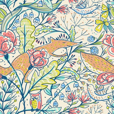 Vector floral seamless pattern with flowers and foxes.This image is a vector illustration and can be scaled to any size without loss of resolution. This image will download as a .eps file.