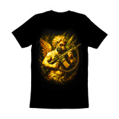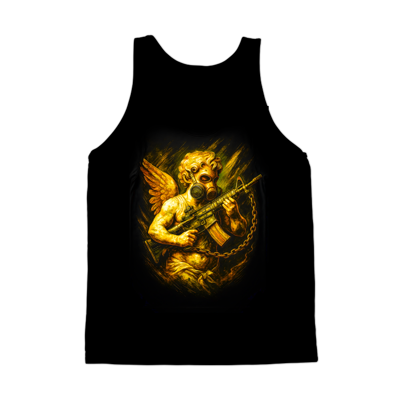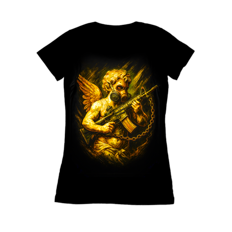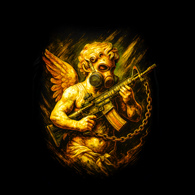 This design features a striking juxtaposition of innocence and aggression. A cherubic figure, reminiscent of classical sculptures, is rendered in a golden hue. The angel has wings and curly hair. However, this is no ordinary angel; it wears a menacing gas mask and wields an assault rifle with a chain around its torso. The background is dark, with hints of yellow and green, creating a sense of foreboding. The overall effect is a blend of classical art and modern warfare, suggesting themes of lost innocence, a dystopian future, or a commentary on the state of the world. The artistic style is reminiscent of a dark, gritty painting, with visible brushstrokes and a textured feel.