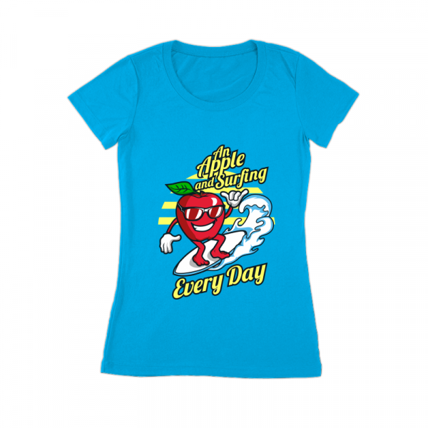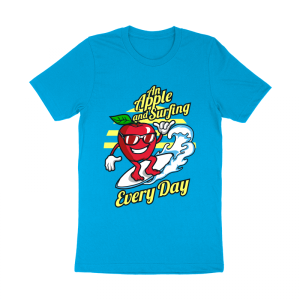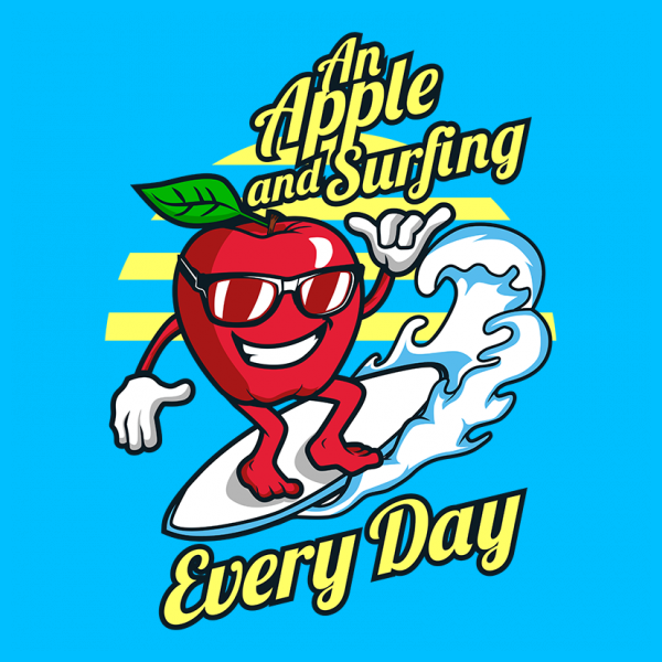 vector illustration of Apple and Surfing cartoon, this image is very cute for t-shirts and posters, this design is available in the form of files, CDR, AI, transparent backround PNG, JPEG, SVG, EPS, mookup not included
