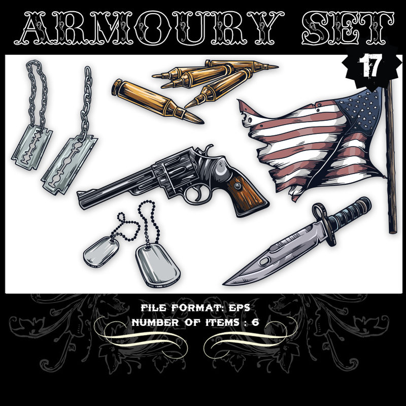 Armoury Set 17 - vector set including gun, bullets, the American flag,knife, razors and dog tags for an army themed design.The file will be available AI and EPS formats.