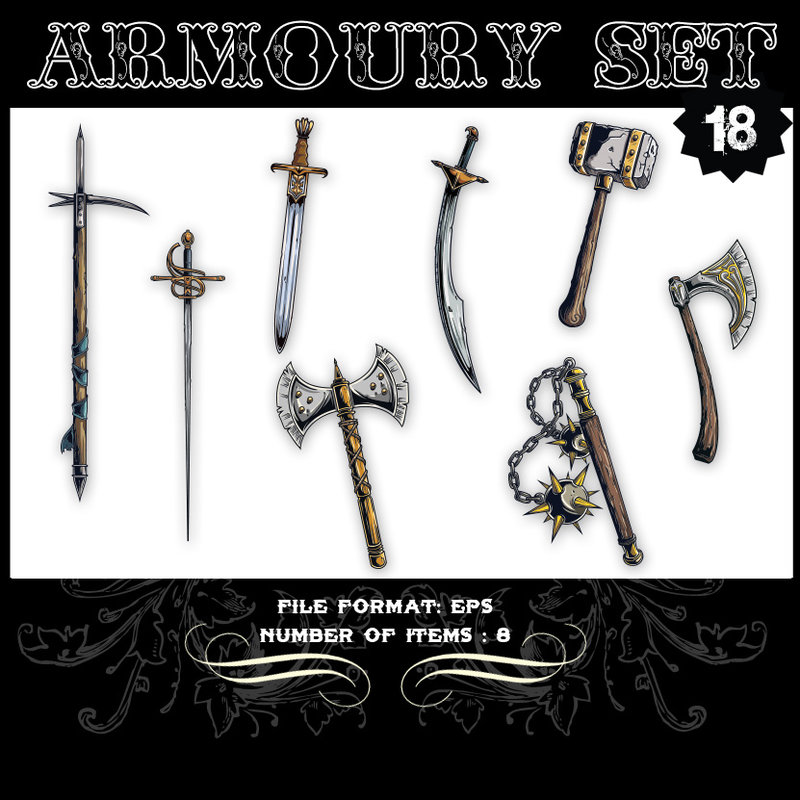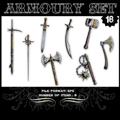 Armoury Set 18 - vector set including weapons of war such as axe, spear, sword, scimitar,mace and hammer.The file will be available AI and EPS formats.