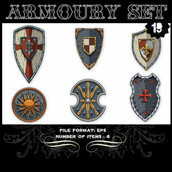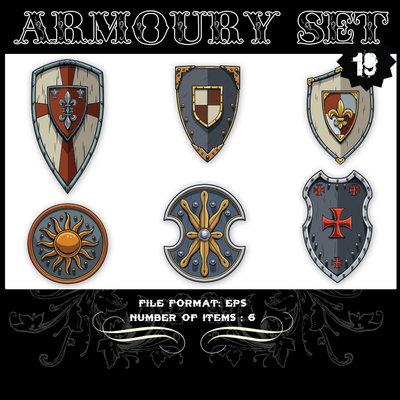 Armoury Set 19 - vector set including different types of warrior shields, made of wood with symbols on them such as sun, fleur du lys or cross.The file will be available AI and EPS formats.