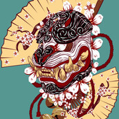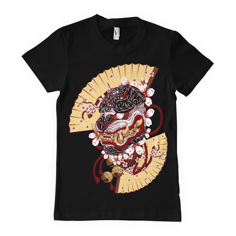 Asian mask T-Shirt Design. Digital illustration of featuring detailed asian mask, fan, flowers, rope and bells.The colors are changeable. The source file is available in AI, EPS, PNG, PSD and SVG format.