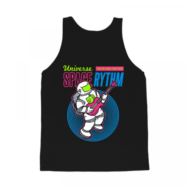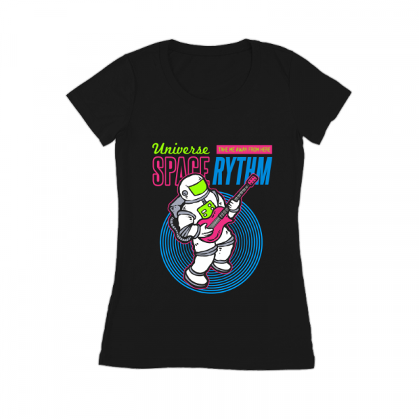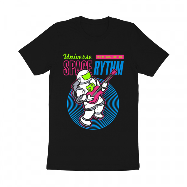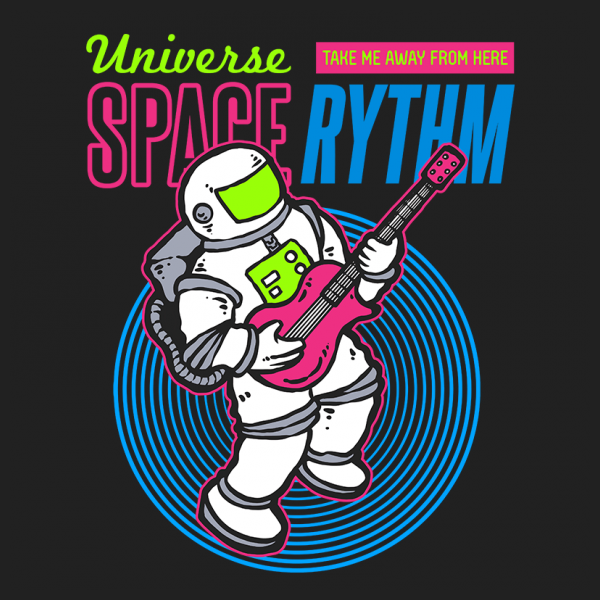 Vector illustration of an astronaut playing electric guitar on space with 80's graphic style. Ready to print on t-shirt.