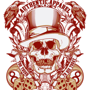 Authentic apparel digital design template in vector format, featuring detailed skull magician now available for Adobe Illustrator, Adobe Photoshop and Corel Draw and can be used for digital printing and screenprinting .
