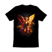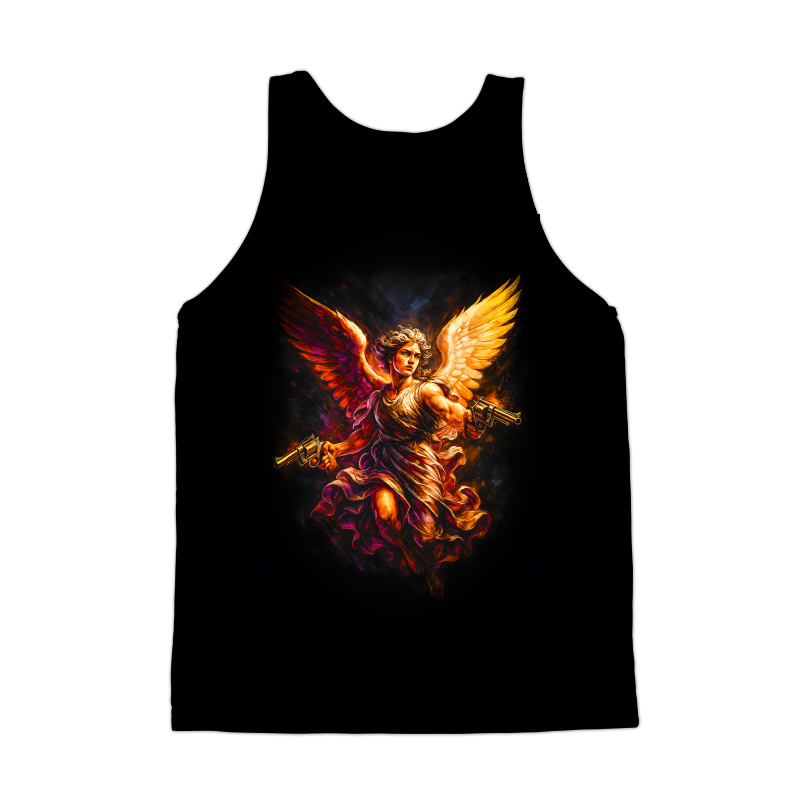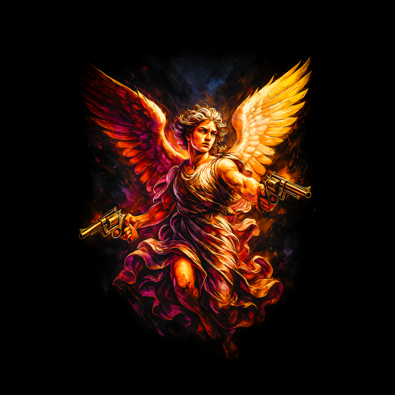 This striking design portrays an angel, not in a traditional serene pose, but as a formidable figure wielding two revolvers. The angel's wings are a vibrant mix of fiery oranges and deep purples, contrasting against the dark background. The angel's determined facial expression adds to the intensity of the piece. The overall style evokes a blend of classical art with a modern, edgy twist. The use of light and shadow creates a dramatic effect, highlighting the angel's strength and resolve. This design could appeal to those seeking bold and unique imagery that challenges conventional representations of angels. Designers could use this image for various purposes, such as creating striking posters, edgy apparel designs, or book covers. The combination of religious and rebellious elements could appeal to a niche market interested in alternative or gothic themes. It could also be incorporated into digital art projects or used as a powerful symbol in graphic novels.