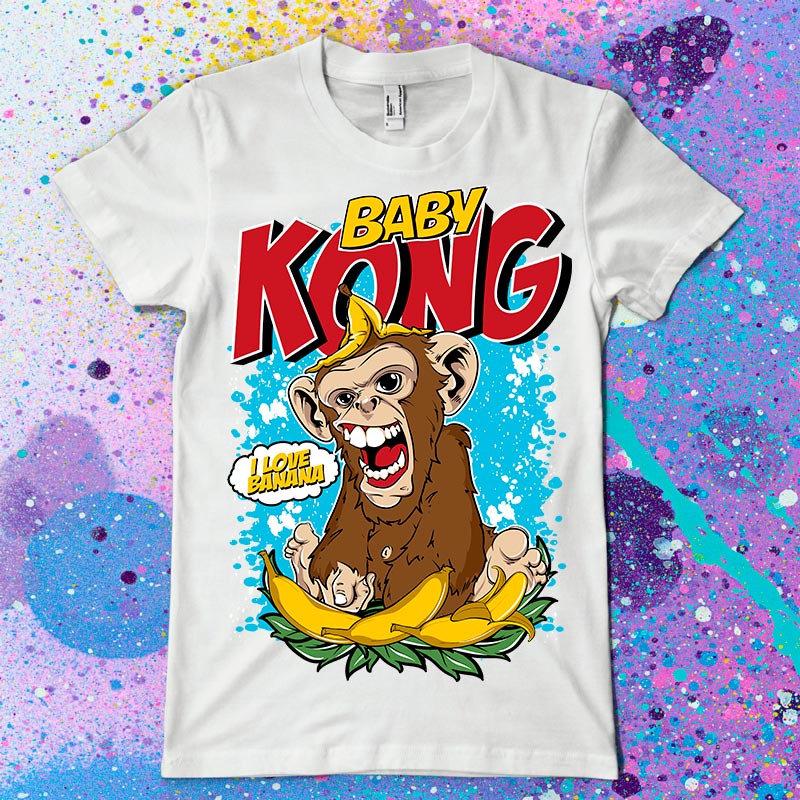 Baby Kong t-shirt design features a Monkey funny design detailed screen print now available for Adobe Illustrator, Adobe Photoshop and can be used for digital printing and screenprinting.