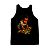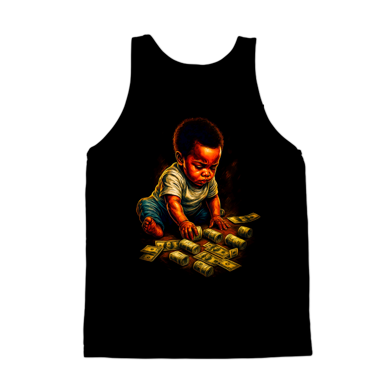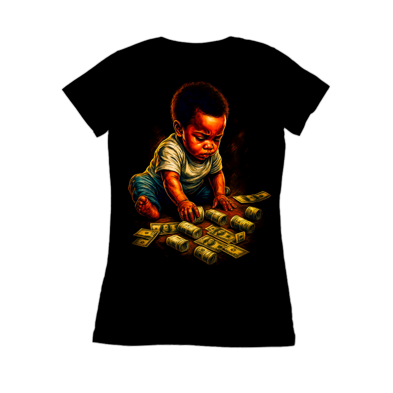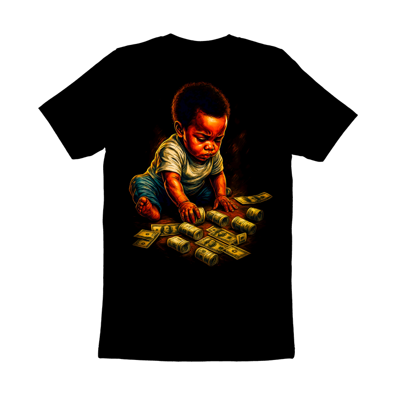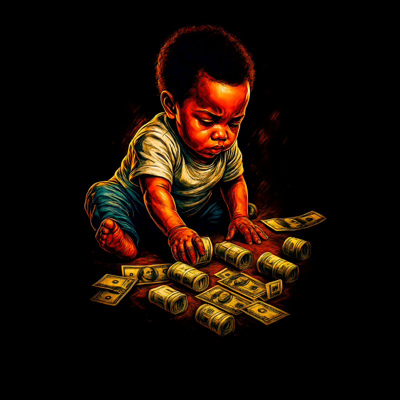 The image presents a stylized depiction of a baby, rendered in a rich, painterly fashion with bold color contrasts and dynamic lighting. The baby, of African descent, is shown sitting amidst a scattering of U.S. currency, both in loose bills and rolled stacks. The lighting emphasizes the baby's face and hands, drawing attention to the interaction with the money. The background is a deep, solid black, which accentuates the vibrant colors and textures of the subject and the money. The overall effect is one of playful opulence, hinting at themes of wealth and future prosperity. The style blends elements of realism with artistic exaggeration, creating a visually striking and thought-provoking composition. Designers could use this image to create eye-catching visuals for financial literacy campaigns aimed at young families. It would also work well for promotional materials targeting investment firms or banking institutions. The image's playful yet sophisticated tone could be leveraged to convey messages about building wealth and securing the future.