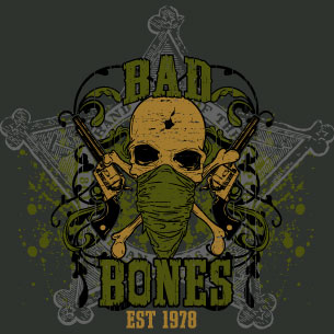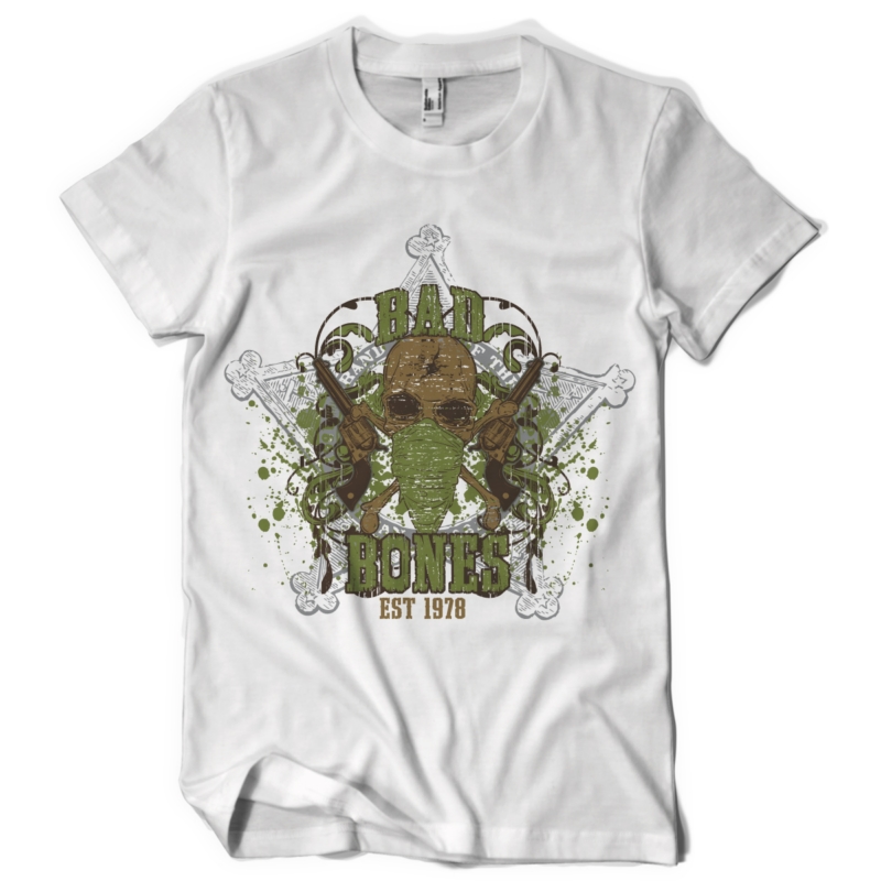 Bad boy t-shirt design featuring detailed skull thief with guns , paper ink spots, bones. Bad bones thief t-shirt template can be used for digital printing and screenprinting and will be available in vector format for Adobe Illustrator, Adobe Photoshop and Corel Draw .