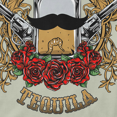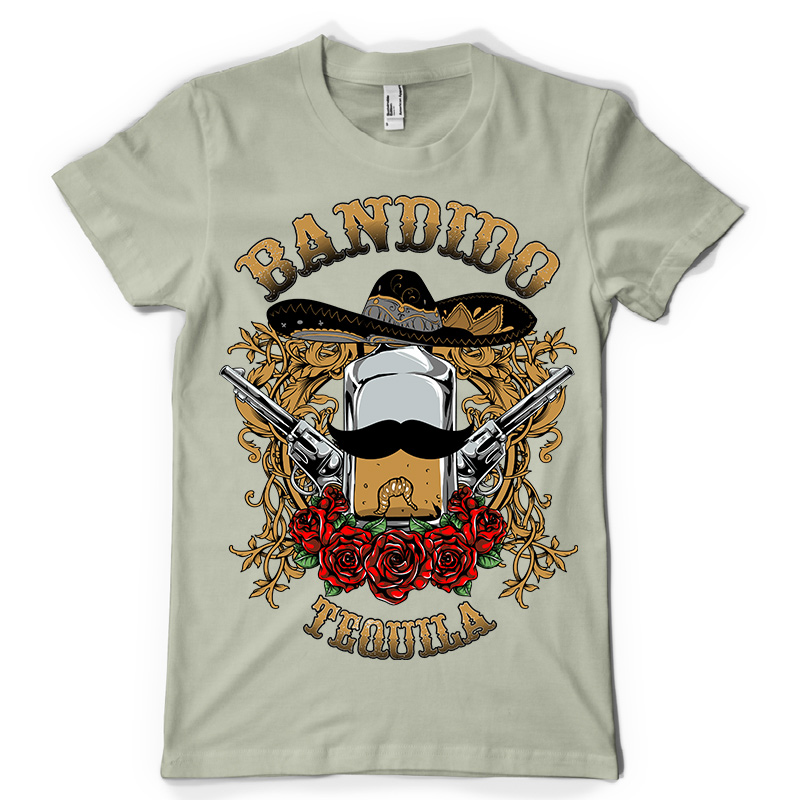Bandido t-shirt design features a detailed screen print of bottle of tequila wearing a sombrero now available for Adobe Illustrator, Adobe Photoshop and Corel Draw and can be used for digital printing and screenprinting .