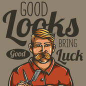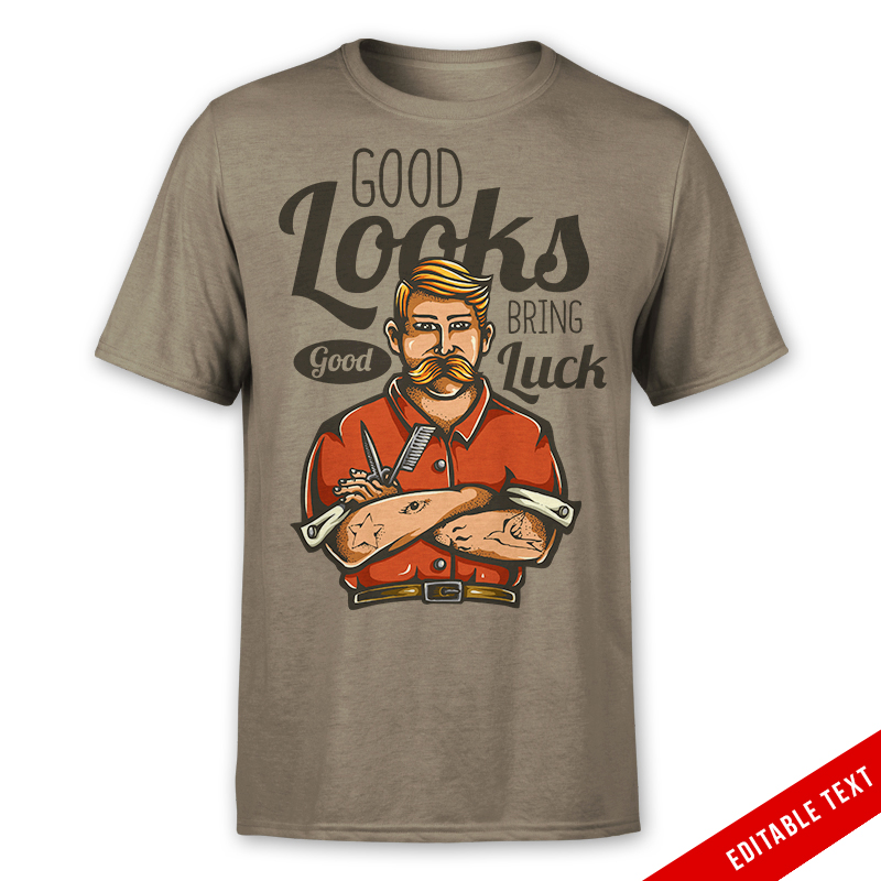 Vector illustration of a hipster barber with mustache, beard and tattoo, editable text. Ready to print on t-shirt.