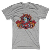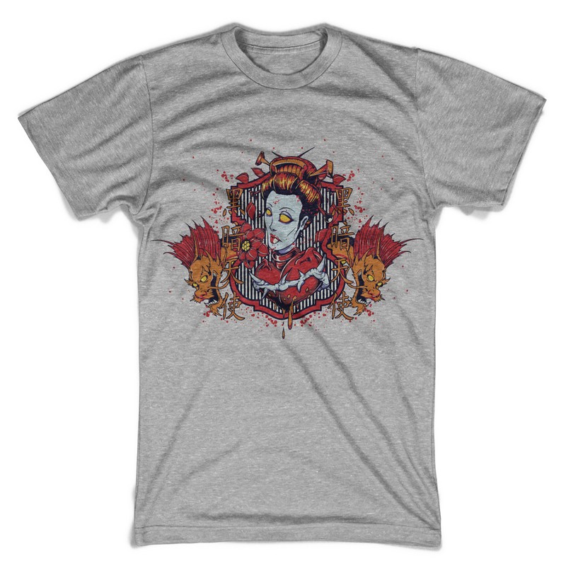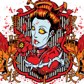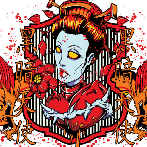 Barbwire digital design template in vector format, featuring detailed geisha zombie and japanese dragons now available for Adobe Illustrator, Adobe Photoshop and Corel Draw and can be used for digital printing and screenprinting .