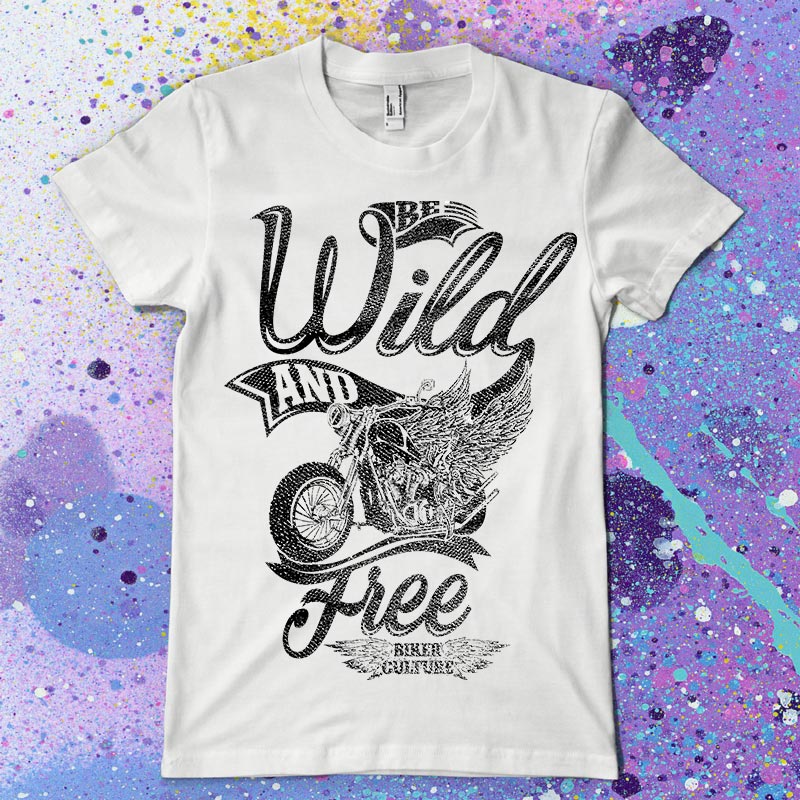 Be Wild And Free t-shirt design features a motorcycle detailed screen print now available for Adobe Illustrator, Adobe Photoshop and Corel Draw and can be used for digital printing and screenprinting