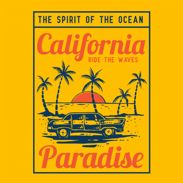 Summer vacation with camping car on the palm tropical beach and sunset background. Ready to print on t-shirt.