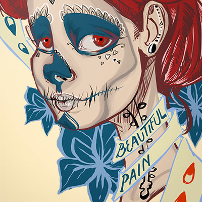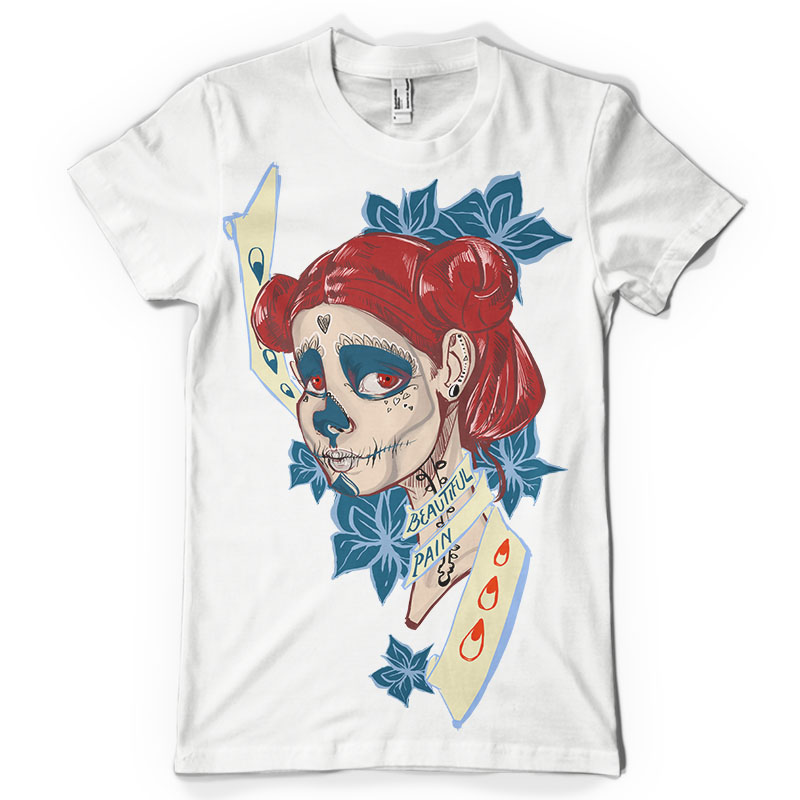 Beautiful pain illustration made by Vizireanu Maria-Magdalena, PSD file , this graphic was inspired by Day of the Dead Mexican celebration.Contain the portrait of a girl with various specific elements of this holiday and text :Beautiful pain.
