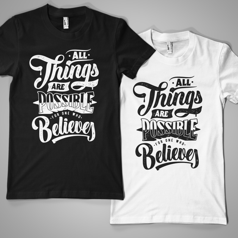 "Beleiver" T-shirt design featuring typography style religious quote, with distressed details. The files available are suitable for Adobe Illustrator and Adobe Photoshop and can be used for digital printing and screenprinting.