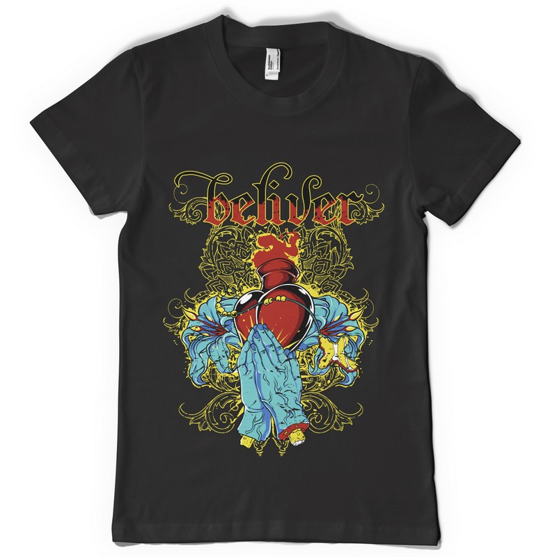 Believe digital design template in vector format, featuring detailed praying hands for all those who believe with all their heart now available for Adobe Illustrator, Adobe Photoshop and Corel Draw and can be used for digital printing and screenprinting .