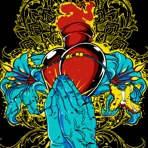 Praying zombie hands with flaming heart