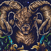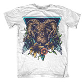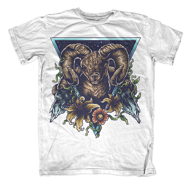 Vector illustration of big horn sheep goat animal skull space stars universe flowers triangle tattoo. Ready to print on t-shirt.