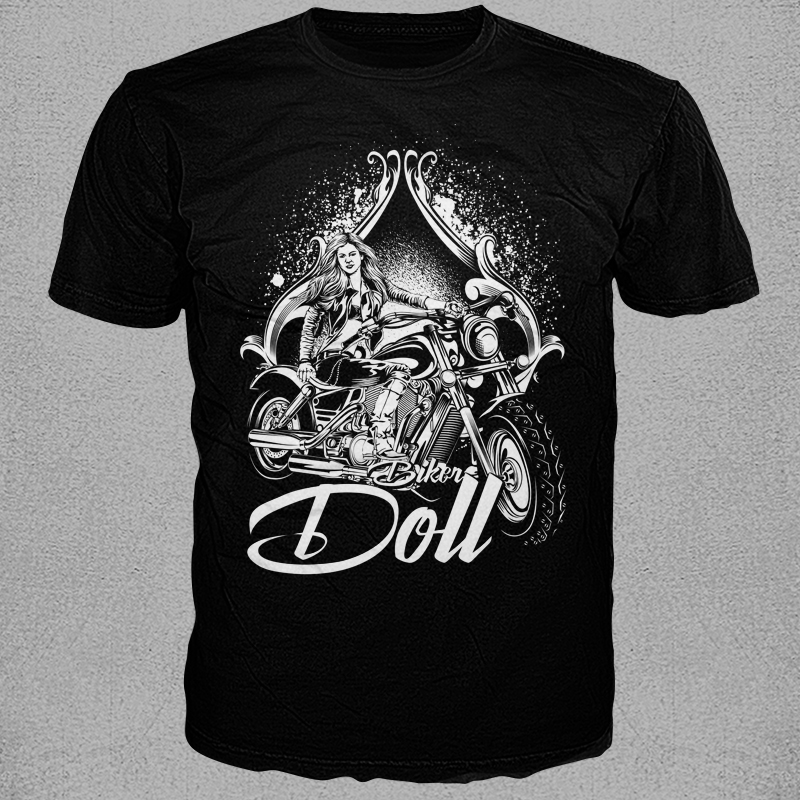 Biker Doll is editable vector Words are separated, colors and size easy editable for any shirt colors.