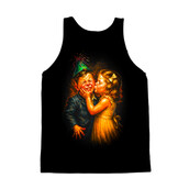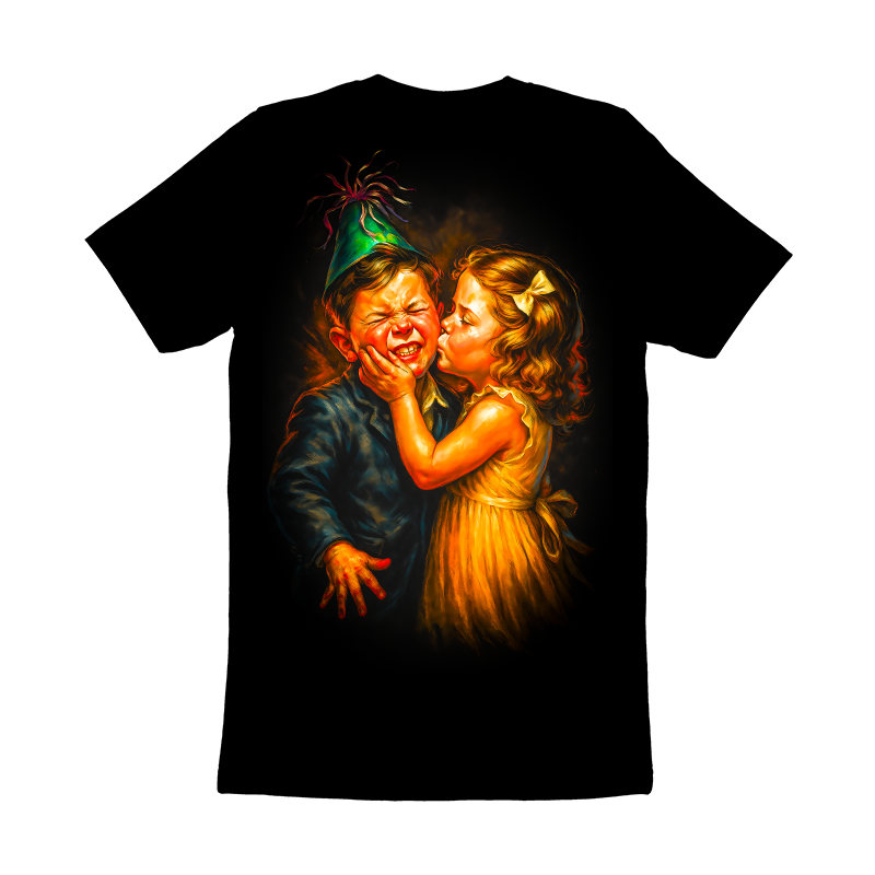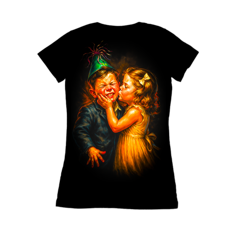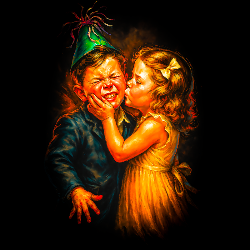 This design captures a comical yet endearing moment between two children at what appears to be a birthday celebration. The boy, donning a green party hat, winces with a forced smile as a girl plants a kiss on his cheek. The artwork is rich with exaggerated expressions and vibrant colors, reminiscent of classic illustration styles. The artist skillfully uses light and shadow to emphasize the characters' emotions and the texture of their clothing. The girl's golden dress and the boy's blue suit are rendered with a painterly quality, adding depth and visual interest to the scene. The overall composition evokes a sense of nostalgia and childhood innocence, making it a potentially appealing design for various applications. Designers could use this image for greeting cards, invitations, or children's book illustrations. Its vintage aesthetic would also work well on posters, apparel, or in advertising campaigns targeting a nostalgic audience. The humorous expressions and charming subject matter make it versatile for both print and digital media, appealing to a wide range of demographics.