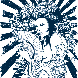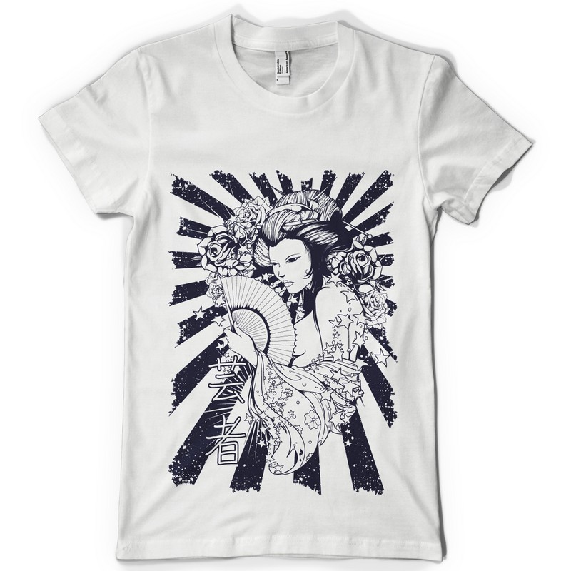 Black and white diva graphic design template in vector format, featuring detailed mysterious geisha now available for Adobe Illustrator, Adobe Photoshop and Corel Draw and can be used for digital printing and screenprinting .