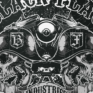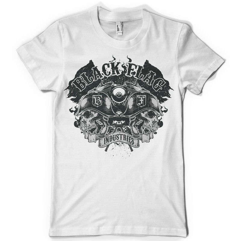 Black Flag Industries printed t-shirt features a detailed screen print of mad bikers skulls now available for Adobe Illustrator, Adobe Photoshop and Corel Draw and can be used for digital printing and screenprinting .