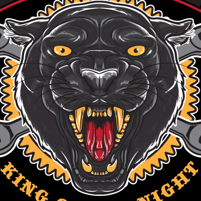 An illustration of an angry Panther head with, wrenchs chain, and some ornaments.