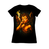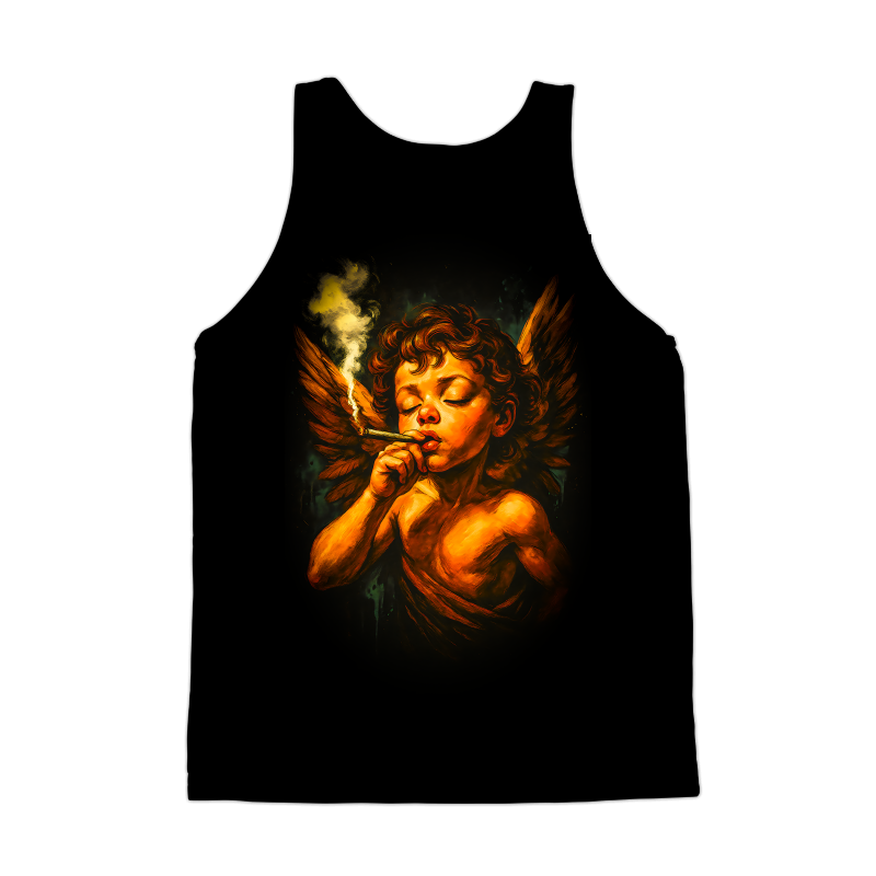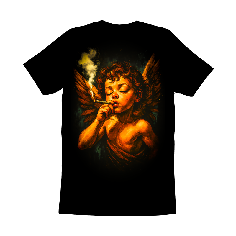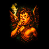 This intriguing design features a cherubic angel, rendered in a style reminiscent of classical paintings, but with a distinctly modern twist. The angel, complete with feathered wings, is depicted smoking what appears to be a hand-rolled cigarette, creating a juxtaposition between the divine and the mundane. The color palette is dominated by warm oranges and yellows, casting a soft, ethereal glow on the subject, while the background features dark greens and blacks, adding depth and contrast. The overall effect is both provocative and thought-provoking, challenging traditional notions of purity and innocence. The design blends classical art with contemporary themes, making it suitable for a variety of applications, from edgy apparel to eye-catching posters and prints. Designers could use this image to create unique apparel designs, posters, or art prints. It could appeal to a market that appreciates art with a subversive edge. The image's blend of classical and contemporary elements makes it versatile for different branding projects, especially those aiming for a blend of sophistication and rebellion.