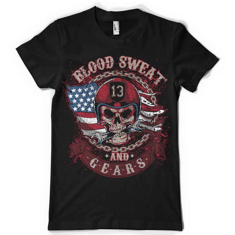 Blood sweat and gears printed t-shirt features a detailed screen print of mad pilot skull now available for Adobe Illustrator, Adobe Photoshop and Corel Draw and can be used for digital printing and screenprinting .