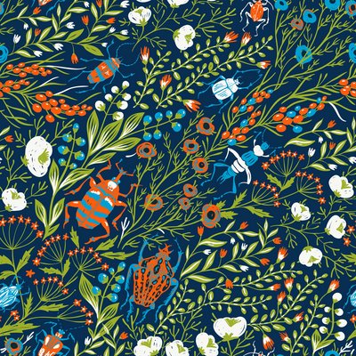 Vector floral seamless pattern with blooming flowers and colorful bugs. This image is a vector illustration and can be scaled to any size without loss of resolution. This image will download as a .eps file.
