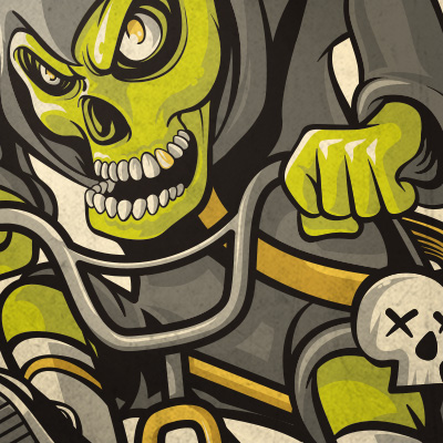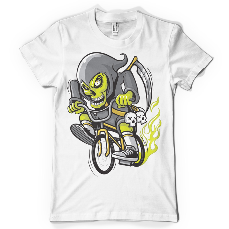 "Bmx Reaper" T-shirt design featuring the gream reaper on a bmx. The files available are suitable for Adobe Illustrator, Adobe Photoshop and Corel Draw and can be used for digital printing and screenprinting.