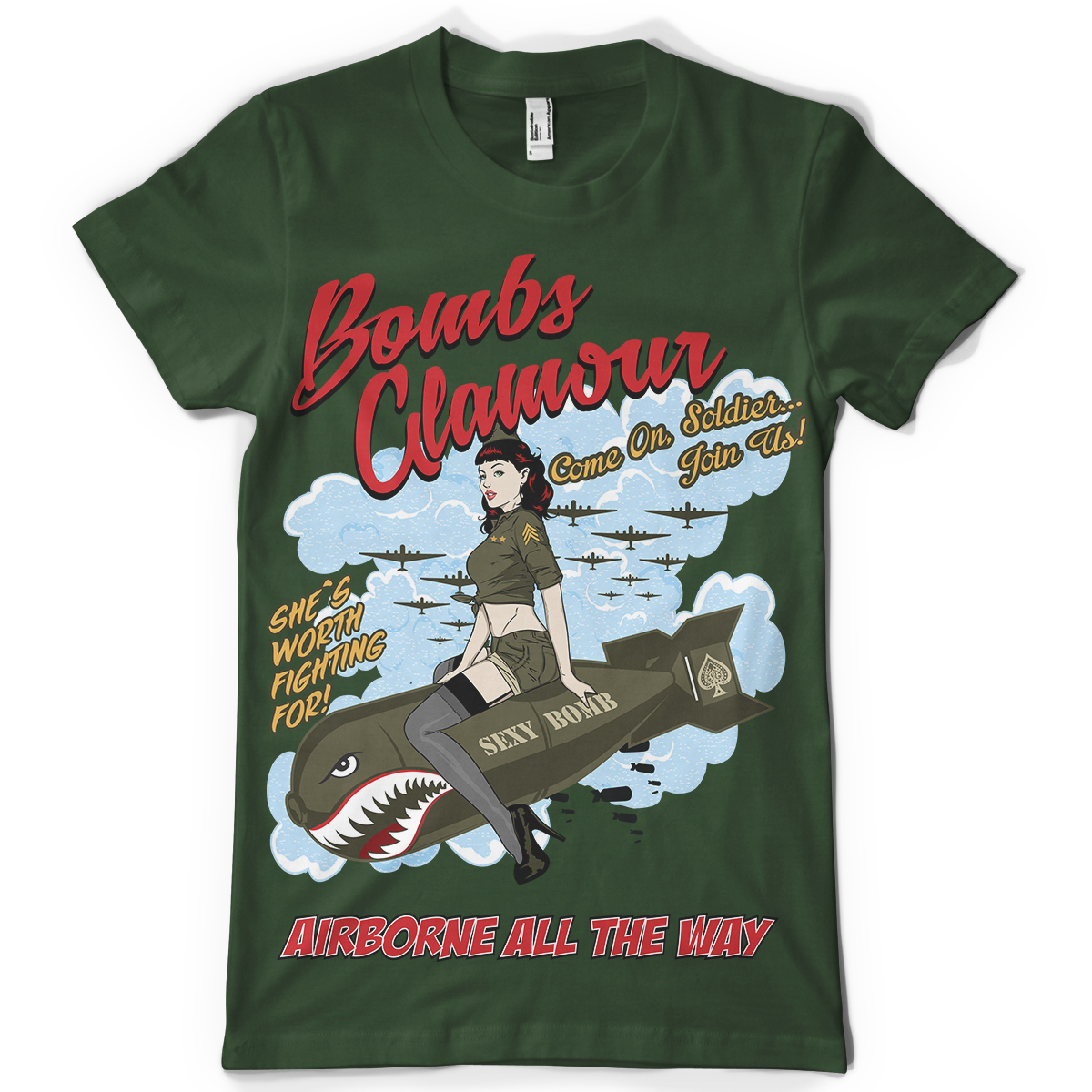 Bombshell t-shirt design features a detailed screen print of sexy army girl now available for Adobe Illustrator, Adobe Photoshop and Corel Draw and can be used for digital printing and screenprinting .