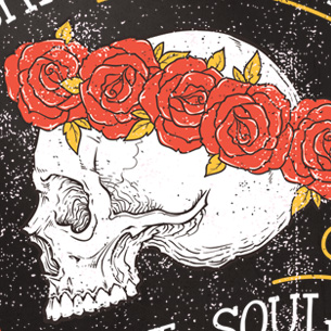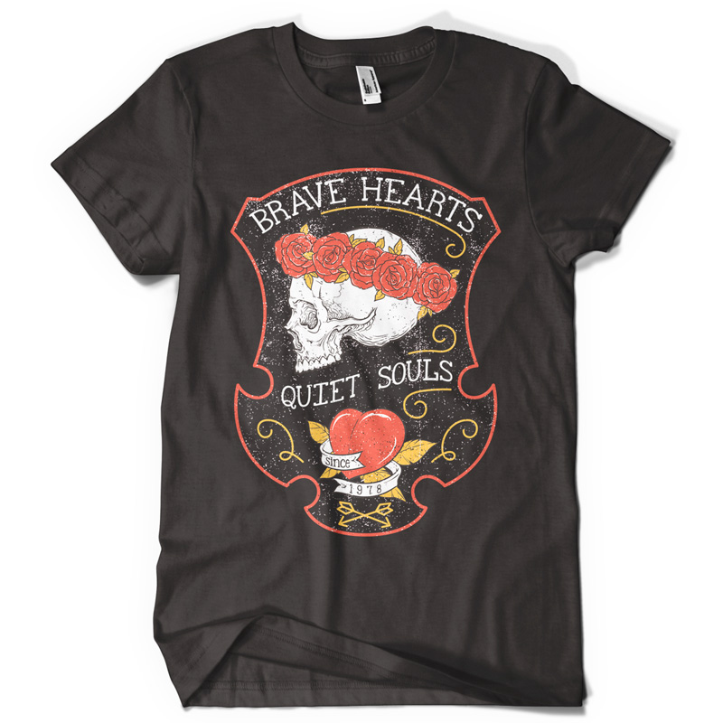 Brave hearts, quiet souls t-shirt design template in vector format, featuring detailed romantic skull wearing a crown of roses now available for Adobe Illustrator, Adobe Photoshop and Corel Draw and can be used for digital printing and screenprinting .