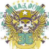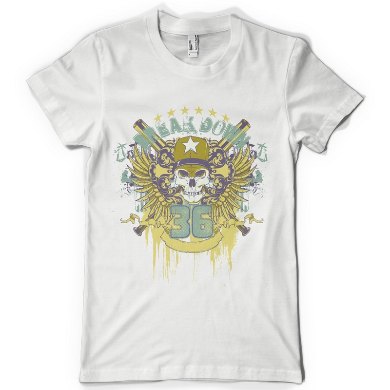 Break down 36 graphic design template in vector format, featuring detailed badass skull with guns now available for Adobe Illustrator, Adobe Photoshop and Corel Draw and can be used for digital printing and screenprinting .