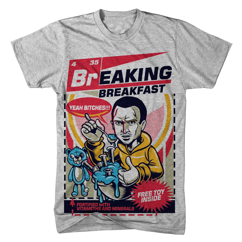 Breaking Breakfast t-shirt design, based on the very popular tv show Breaking Bad, featuring one of the main characters Jesse Pinkman, in a parody style design similar to those seen on cereal boxes.