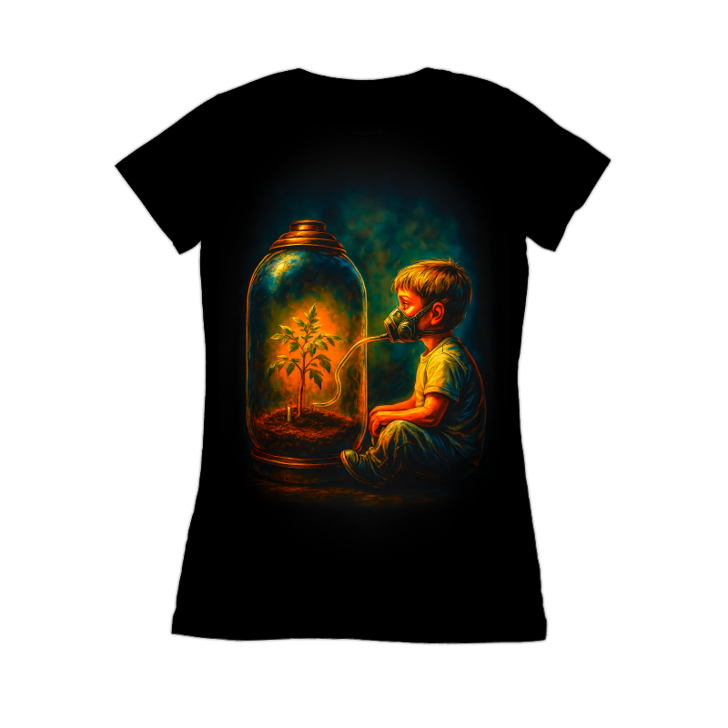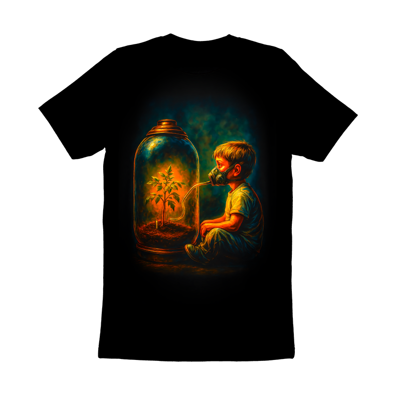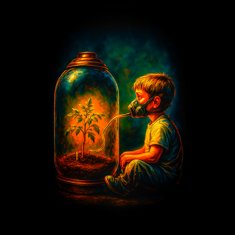 This poignant digital artwork depicts a young boy with a gas mask connected to a large glass jar containing a small, vibrant plant. The contrast between the boy's protective gear and the plant's life-sustaining presence highlights themes of environmental concern and the preciousness of nature. The color palette is rich and dramatic, with warm oranges and yellows illuminating the interior of the jar, contrasting against the cooler, darker tones surrounding the boy. The overall style evokes a sense of realism with painterly textures, creating a compelling narrative about survival, hope, and the future. The image prompts reflection on the importance of preserving our environment for future generations, making it a powerful visual statement. Designers could use this image to create impactful visuals for environmental campaigns, educational materials, or awareness posters. The strong symbolism and emotional resonance make it suitable for conveying messages about climate change, pollution, and the need for sustainable practices. It can also be incorporated into book covers, magazine articles, or digital content related to environmental themes.
