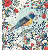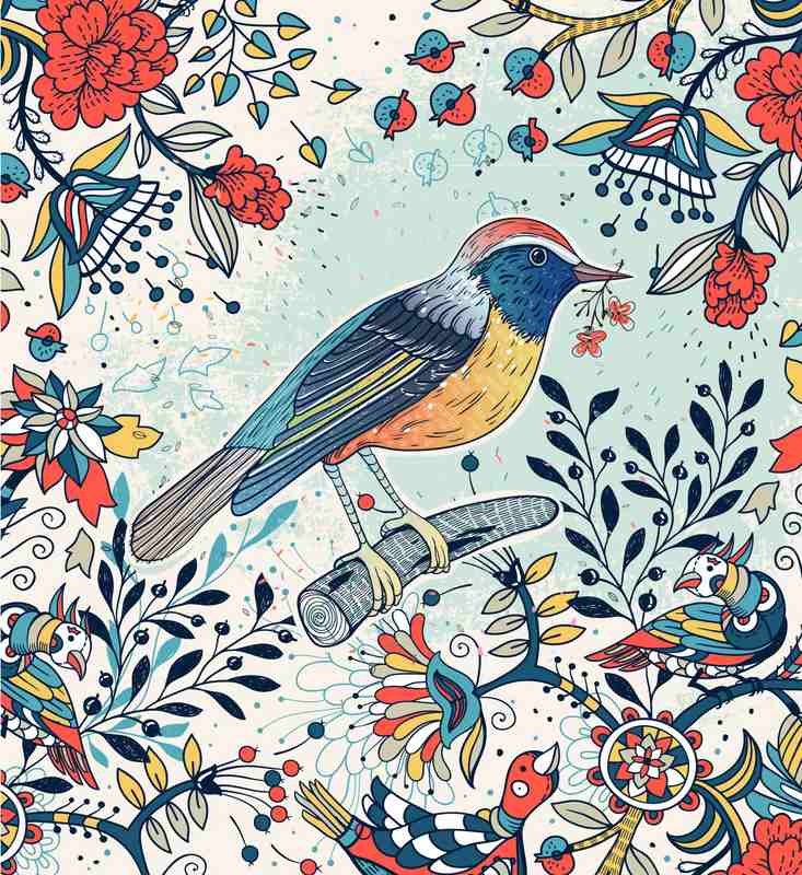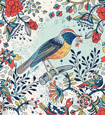 Vector floral illustration of a bird with blooming flowers on a bright blue background. This image is a vector illustration and can be scaled to any size without loss of resolution.